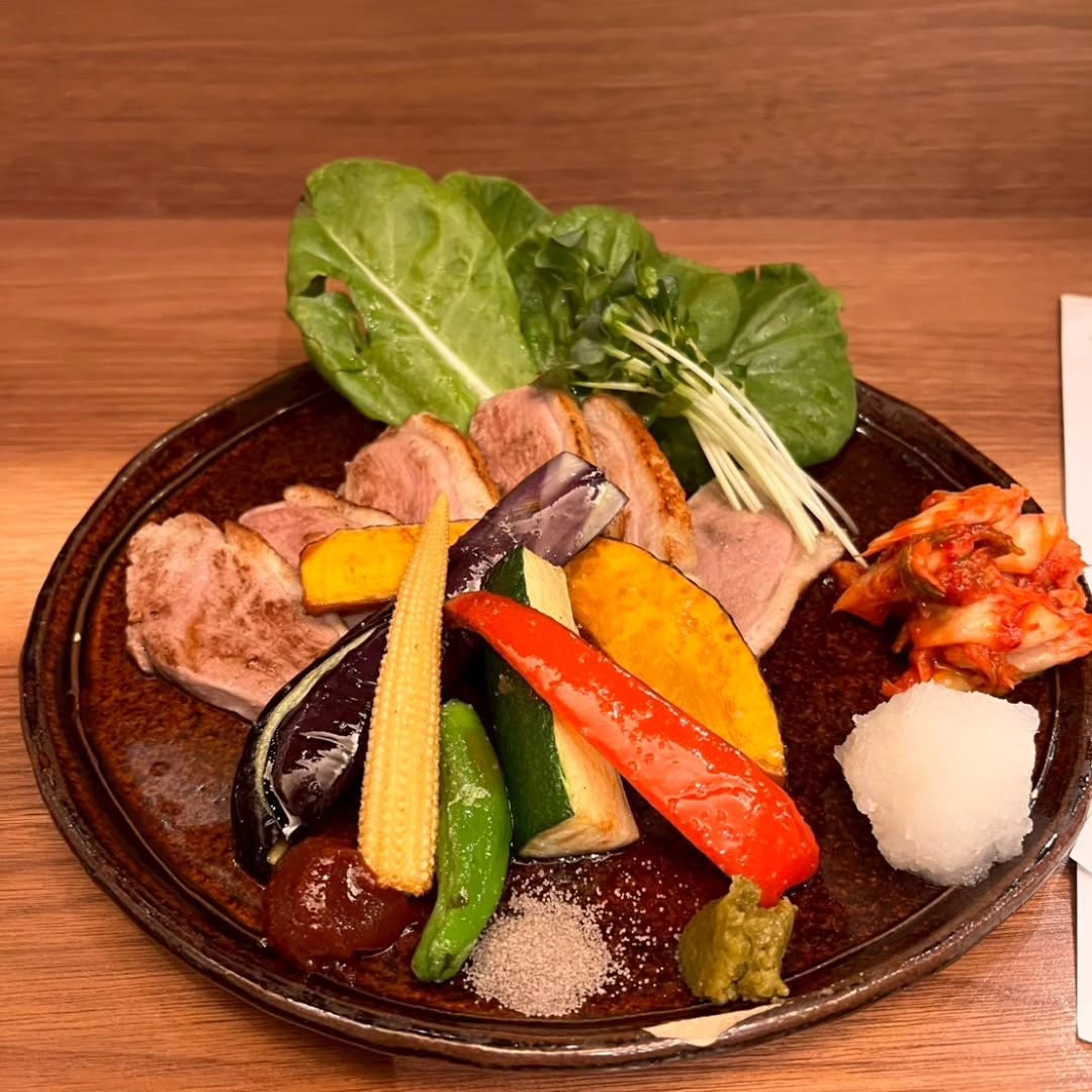 サンチュ、キムチ、野菜、鴨肉を巻き巻き!