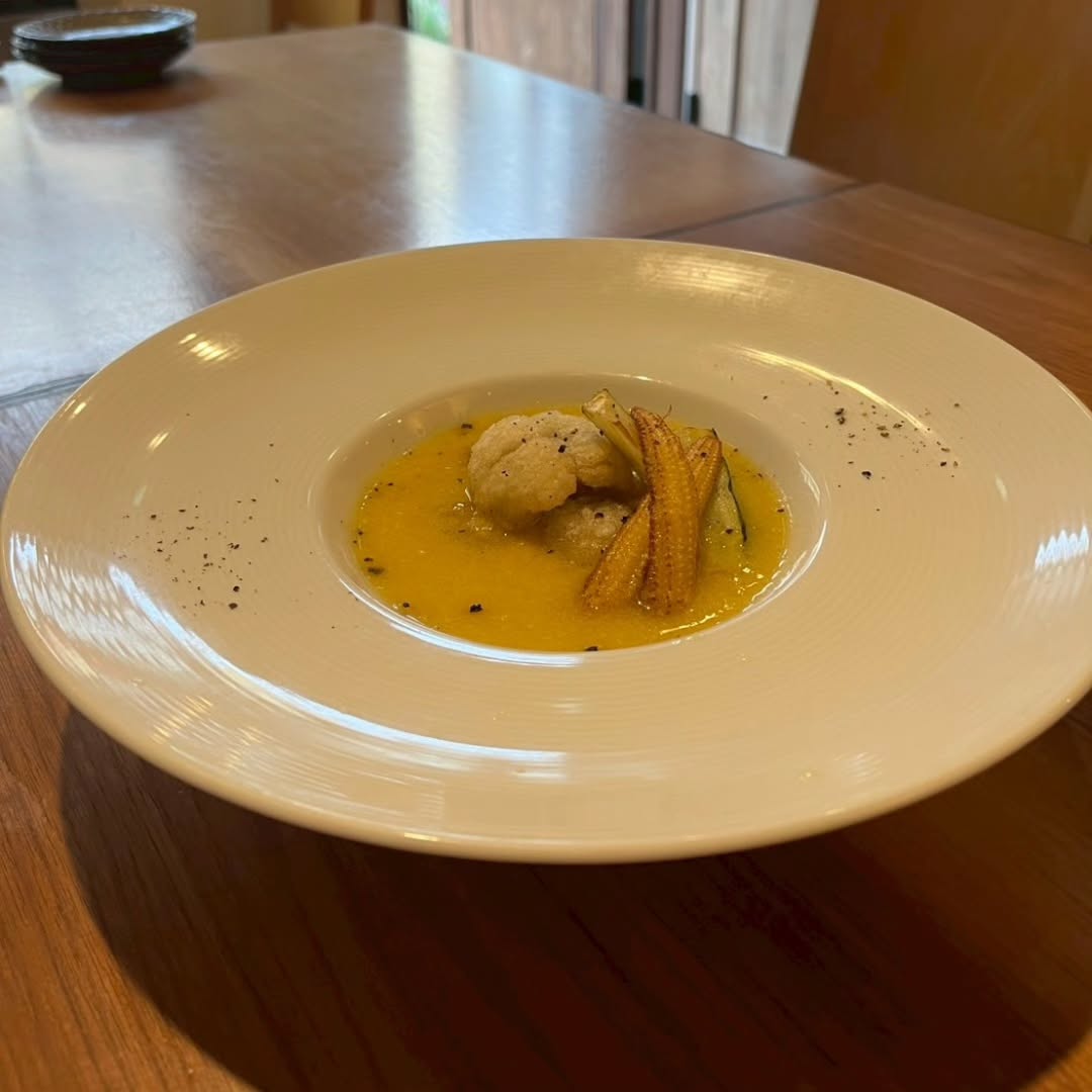 鱧唐揚げ、ズッキーニ、ヤングコーン、とうもろこしすり流し