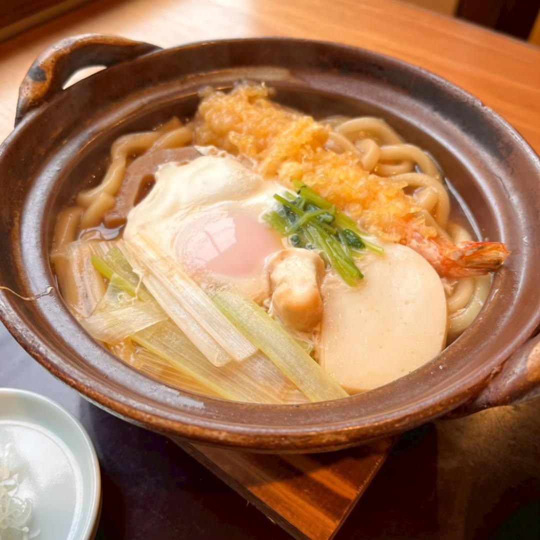 熱々【鍋焼きうどん】が始まりました! 海老天ぷら、蒲鉾、煮物、お麩、玉子等